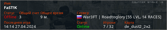 Играет на Counter Strike 1.6 сервере. Страна: РоссияПервый раз замечен 10:54 24.01.2024
