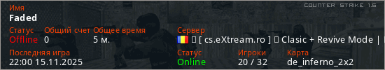 Играет на Counter Strike 1.6 сервере. Страна: РумынияПервый раз замечен 21:58 15.11.2025