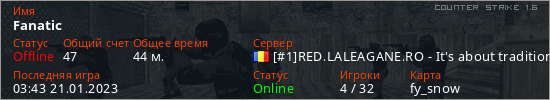 Играет на Counter Strike 1.6 сервере. Страна: РумынияПервый раз замечен 03:15 08.01.2023