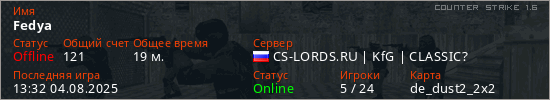 Играет на Counter Strike 1.6 сервере. Страна: РоссияПервый раз замечен 15:13 26.01.2025