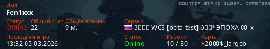 Играет на Counter Strike Global Offensive сервере. Страна: РоссияПервый раз замечен 18:19 04.03.2026