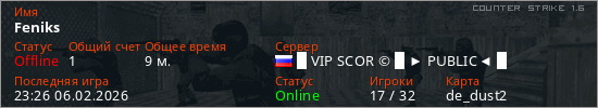 Играет на Counter Strike 1.6 сервере. Страна: РоссияПервый раз замечен 22:42 06.02.2026