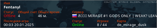 Играет на Counter Strike Global Offensive сервере. Страна: РоссияПервый раз замечен 23:10 09.01.2025