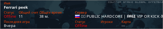 Играет на Counter Strike Global Offensive сервере. Страна: РоссияПервый раз замечен 11:21 12.02.2026