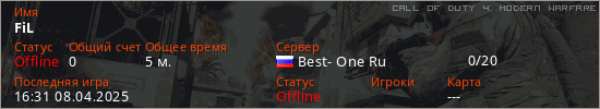 Играет на Call of Duty 4: Modern Warfare сервере. Страна: РоссияПервый раз замечен 16:29 08.04.2025
