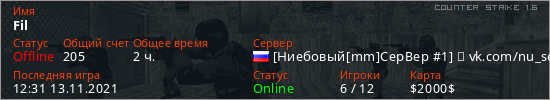 Последний раз был в сети 12:31 13.11.2021 Игрок с таким ником замечен на 19 серверах