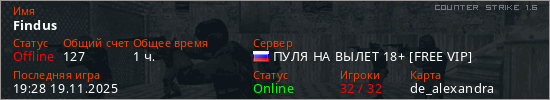 Играет на Counter Strike 1.6 сервере. Страна: РоссияПервый раз замечен 19:26 10.10.2025