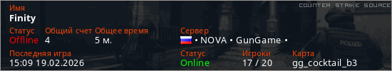 Играет на Counter Strike Source сервере. Страна: РоссияПервый раз замечен 15:07 19.02.2026