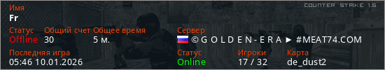Играет на Counter Strike 1.6 сервере. Страна: РоссияПервый раз замечен 05:38 10.01.2026