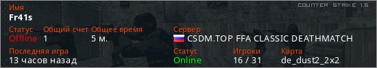 Играет на Counter Strike 1.6 сервере. Страна: РоссияПервый раз замечен 19:38 07.03.2026