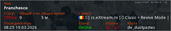 Играет на Counter Strike 1.6 сервере. Страна: РумынияПервый раз замечен 08:23 19.03.2026