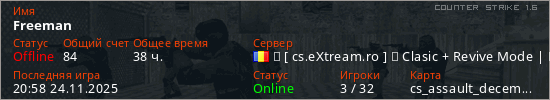 Играет на Counter Strike 1.6 сервере. Страна: РумынияПервый раз замечен 22:31 27.12.2024