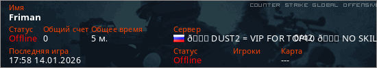 Играет на Counter Strike Global Offensive сервере. Страна: РоссияПервый раз замечен 17:43 14.01.2026