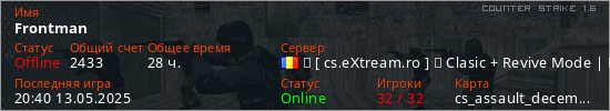 Играет на Counter Strike 1.6 сервере. Страна: РумынияПервый раз замечен 20:14 01.01.2025