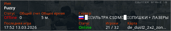 Играет на Counter Strike 1.6 сервере. Страна: РоссияПервый раз замечен 17:50 13.03.2026