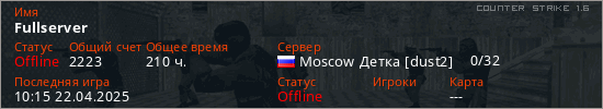 Играет на Counter Strike 1.6 сервере. Страна: РоссияПервый раз замечен 21:16 30.07.2020