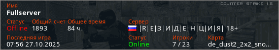 Последний раз был в сети 07:56 27.10.2025 Игрок с таким ником замечен на 46 серверах