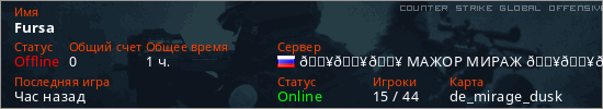 Играет на Counter Strike Global Offensive сервере. Страна: РоссияПервый раз замечен 08:59 26.10.2025