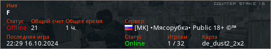Играет на Counter Strike 1.6 сервере. Страна: РоссияПервый раз замечен 11:23 30.04.2023