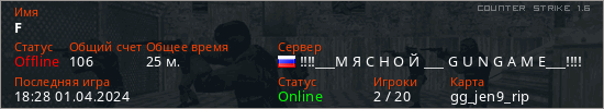 Играет на Counter Strike 1.6 сервере. Страна: РоссияПервый раз замечен 22:10 11.03.2023