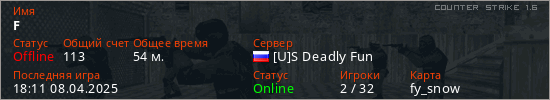 Играет на Counter Strike 1.6 сервере. Страна: РоссияПервый раз замечен 22:57 08.05.2022