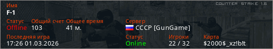 Играет на Counter Strike 1.6 сервере. Страна: РоссияПервый раз замечен 18:31 24.02.2026