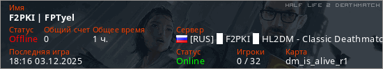 Играет на Half Life 2 DeathMatch сервере. Страна: РоссияПервый раз замечен 16:49 20.11.2025
