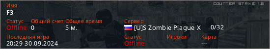 Играет на Counter Strike 1.6 сервере. Страна: РоссияПервый раз замечен 20:27 30.09.2024