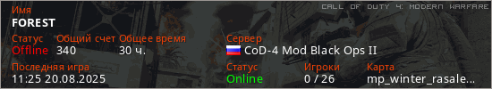 Играет на Call of Duty 4: Modern Warfare сервере. Страна: РоссияПервый раз замечен 11:46 11.11.2024