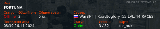 Играет на Counter Strike 1.6 сервере. Страна: РоссияПервый раз замечен 08:33 26.11.2024
