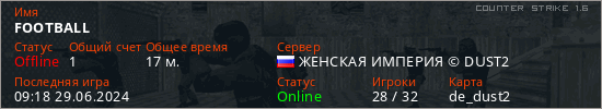 Играет на Counter Strike 1.6 сервере. Страна: РоссияПервый раз замечен 11:41 11.06.2024
