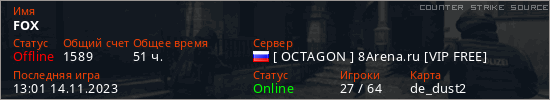 Играет на Counter Strike Source сервере. Страна: РоссияПервый раз замечен 20:54 25.12.2019