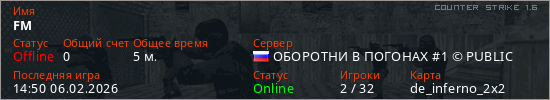 Играет на Counter Strike 1.6 сервере. Страна: РоссияПервый раз замечен 14:39 06.02.2026