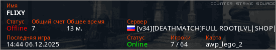 Играет на Counter Strike Source сервере. Страна: РоссияПервый раз замечен 20:03 08.11.2025
