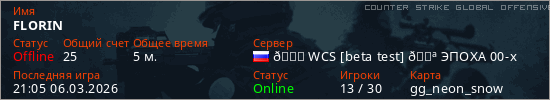 Играет на Counter Strike Global Offensive сервере. Страна: РоссияПервый раз замечен 20:40 06.03.2026