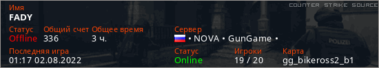 Играет на Counter Strike Source сервере. Страна: РоссияПервый раз замечен 21:17 01.08.2022