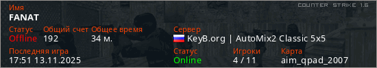 Играет на Counter Strike 1.6 сервере. Страна: РоссияПервый раз замечен 20:44 02.09.2024