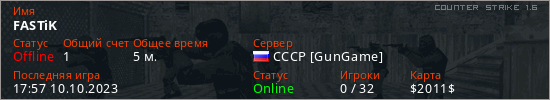 Играет на Counter Strike 1.6 сервере. Страна: РоссияПервый раз замечен 17:49 10.10.2023