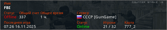 Играет на Counter Strike 1.6 сервере. Страна: РоссияПервый раз замечен 17:10 02.11.2023