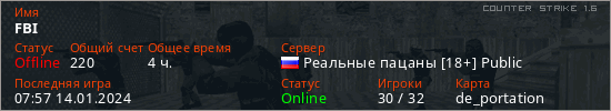 Играет на Counter Strike 1.6 сервере. Страна: РоссияПервый раз замечен 16:48 14.01.2023