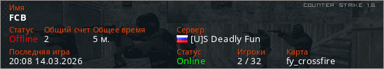 Играет на Counter Strike 1.6 сервере. Страна: РоссияПервый раз замечен 20:02 14.03.2026