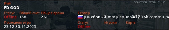 Играет на Counter Strike 1.6 сервере. Страна: РоссияПервый раз замечен 21:30 09.10.2021