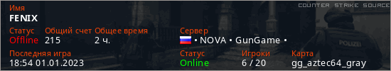 Играет на Counter Strike Source сервере. Страна: РоссияПервый раз замечен 20:34 25.12.2022