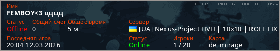 Играет на Counter Strike Global Offensive сервере. Страна: УкраинаПервый раз замечен 19:07 10.03.2026