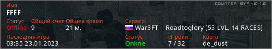 Играет на Counter Strike 1.6 сервере. Страна: РоссияПервый раз замечен 03:15 23.01.2023