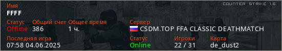 Играет на Counter Strike 1.6 сервере. Страна: РоссияПервый раз замечен 16:01 27.08.2022