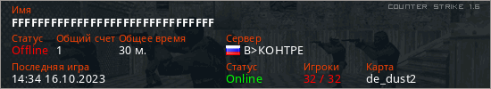 Играет на Counter Strike 1.6 сервере. Страна: РоссияПервый раз замечен 16:38 24.05.2022
