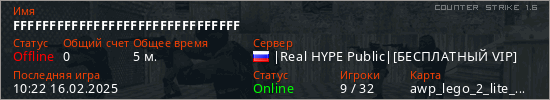 Играет на Counter Strike 1.6 сервере. Страна: РоссияПервый раз замечен 10:20 16.02.2025