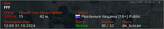 Играет на Counter Strike 1.6 сервере. Страна: РоссияПервый раз замечен 02:47 01.03.2023