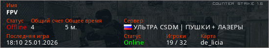 Играет на Counter Strike 1.6 сервере. Страна: РоссияПервый раз замечен 18:08 25.01.2026